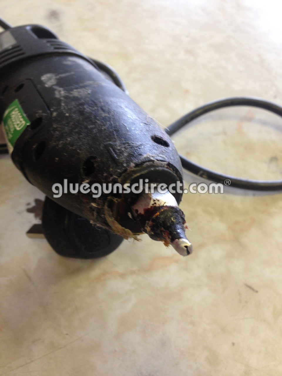 Glue guns that have been left on for too long a period without use (often 30 minutes or more) on a regular basis suffer from the risk of charred glue blocking the nozzle or stopping the ball and spring inside the nozzle from operating allowing the molten glue to flow without trigger pressure. Damaged nozzles due to hard work need to be replaced for optimum performance!