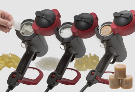 Pneumatic hand held glue guns for bulk adhesives (Pillows, Slats, Granules) and shaped (43mm) hot melt adhesives.